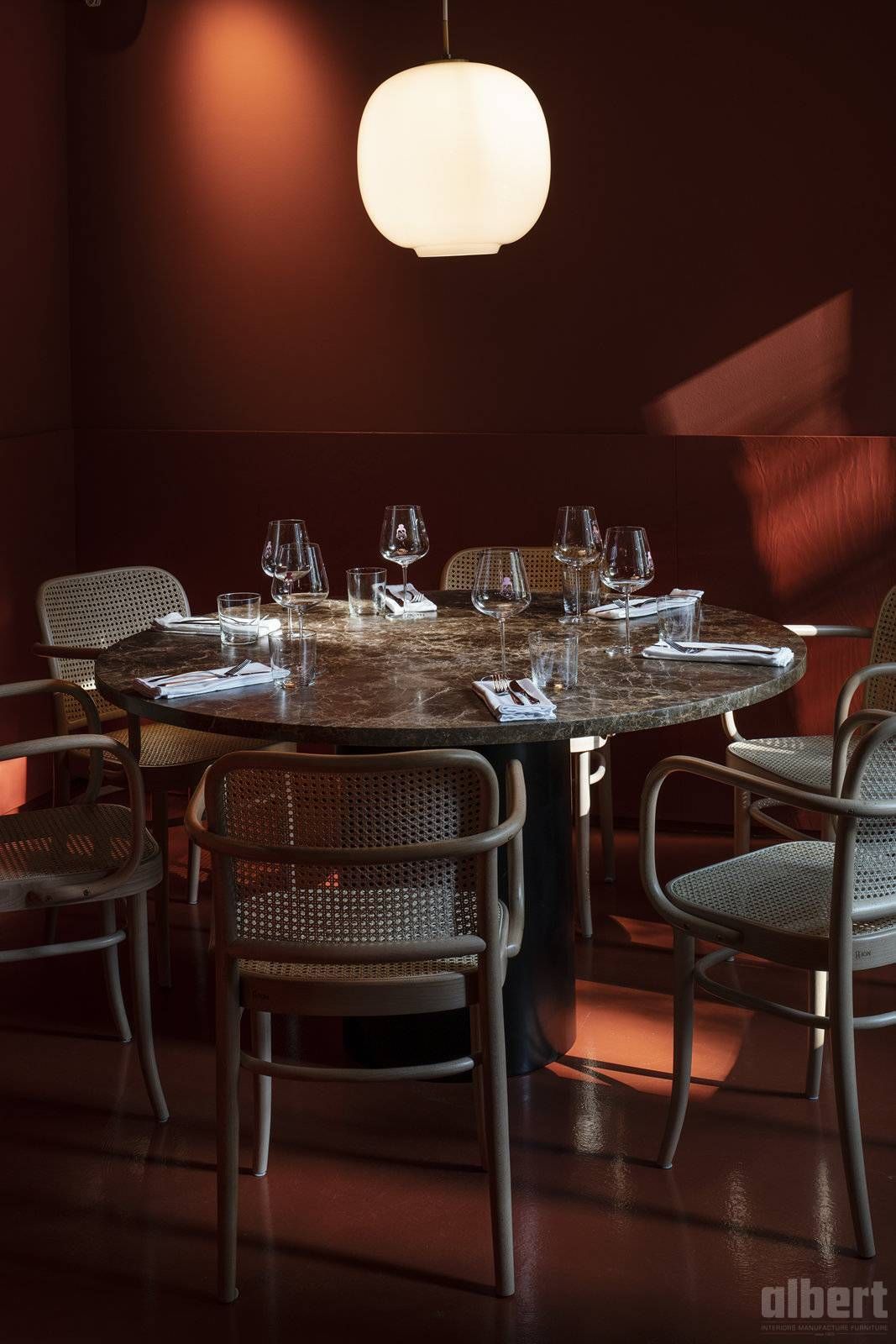 albert interior verantwortete die Kompletteinrichtung und bewies, was es bedeutet, einen solchen Anspruch konsequent in die Fläche zu bringen: ein Interieur, das Haltung zeigt, ohne laut zu sein, und das den Charakter dieses außergewöhnlichen Gastro-Kosmos auf den Punkt bringt.